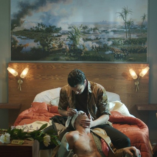 With Occidental, Beloufa seems to be surveying a microcosm of tensions and suspicions within Western Europe, with a stylish eye informed by late Fassbinder and early Almodóvar. The production design for the film, by Dan Perez, is indeed striking and immaculately crafted—the attention to detail being especially clever. (Note: a row of three gold stars over the entrance followed by a black velcro square, implying the fourth star fell off; and murals depicting French colonial wars that adorn the hotel walls.) Beloufa maneuvers his camera through the elaborate, multi-tiered lobby set with elegant assurance, but his script lacks that confidence. Despite some play with language and malapropism (one of the Italians, upon entering their room, exclaims, “So this is your Hotel Occipital?”) and a few nods to Last Year at Marienbad, Occidental never seems fully fleshed-out as drama, satire, or political statement. Late in the film, when the hotel has gone up in flames and the masses in the street have begun to speculate on what’s taking place, an anonymous protestor bluntly states, “We have to destroy one world so another may emerge.” His companion’s response is a noncommittal gesture somewhere between a nod and a shrug, which is all too reflective of the muddled Occidental. Beloufa’s clearly an artist with a distinctive cinematic approach; here’s hoping his next film matches that style with a sharper sense of purpose. AE