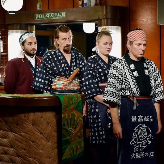 The dual narrative here involves a Syrian refugee, Khaled (Sherwan Haji), who arrives in Helsinki stashed underneath some coal on a parked barge, and who hops the fence of an immigration service point after attempting to seek asylum legally. There’s also a shirt salesman, Wikström (Sakari Kuosmanen), who uses a mammoth poker payday to open a restaurant called the Golden Pint. The paths of these two cross when Wikström fishes Khaled out from behind The Golden Pint’s dumpster and a fistfight swiftly turns into a janitorial job offer. A cloud of sadness hovers over both, basically sweet and decent men. Khaled was separated from his sister on the Balkan route, and though he falls “in love” with Helsinki, he looks lost dumping way too much detergent into a coin-operated washing machine or sharing a beer (“or whatever it is they drink here”) and watching music with his Iraqi station-mate. (In one scene, Khaled even reveals a secret gift for the guitar.) Wikström is introduced placing his wedding ring on the table next to his chain-smoking, alcoholic wife, both quietly fed-up with each other for the time being. The film turns more baldly comedic once we enter the Golden Pint, which has a starchy, seniors’ civic center vibe; it has an out-of-place Hendrix poster on the wall, serves only sardines, meatballs, and potatoes, and comes bundled with a three-person staff, including a chef who sleeps standing up with a lit cig in his mouth. When the gang decide that sushi is trendy, they go Japanese—the broad sight gags include hasty signage and kimonos and horrifying gobs of wasabi. But tuned into the violence, fear, and danger that accompany immigration, The Other Side of Hope avoids cute cuddliness, thanks to its tone-perfect acting and Kaurismäki’s arch compassion. Justin Stewart