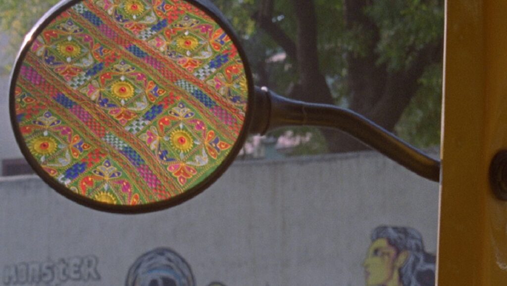 The first feature-length work from avant-garde filmmaker/animator/composer Jodie Mack defies easy categorization. The Grand Bizarre is a sort of musical (like her Yard Work Is Hard Work and Dusty Stacks of Mom) in that Mack’s rhythmic editing is synchronized with her original synth-pop score, which seamlessly integrates the ambient sound of machines, human voices, and wildlife. Grand Bizarre is also a landscape film, in which wide shots of scenic vistas around the world become staging areas for the stop-motion choreography of colorful fabrics, their geometric and floral patterns pirouetting and ping-ponging across the frame, or filling it in vibrant close-up. The film then becomes a strange kind of ethnography of labor, but one in which laborers themselves remain mostly out of sight, the shipping containers they move and looms they work lent a perpetual, dehumanized momentum by Mack’s animation of the 16mm images. The combined effect of her animation, the time-lapse photography, and the movement of natural elements such as wind, water, and the rise and fall of the sun captured within gives The Grand Bizarre a polyrhythmic dynamism. Mack’s cutting has rarely been so purposefully kinetic; the sequence where she rapidly edits together images of machines in a textile factory with the half-formed fabrics they’re weaving approaches a kind of analog glitch art. […] The viewer becomes especially aware of how the textiles are positioned and juxtaposed within the frame, at the end, when Mack slows down the pace and lets the sound of the winding Bolex become the soundtrack. Her work as filmmaker cataloguing and capturing these objects becomes part of the perpetual motion machine propelling them around the world, just as the montage that opened the film linked her travel in producing the film to that larger process. Alex Engquist [Excerpted from full review.]