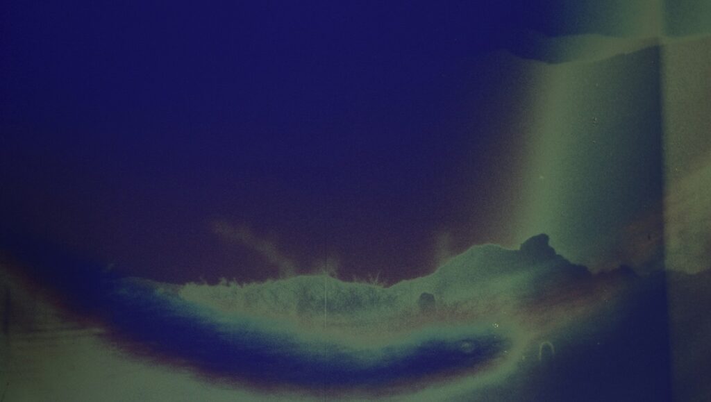 The footage that follows now consists of wide, sweeping landscape shots that have been color reversed and manipulated on a tangible level (Saïto shot earthearthearth with a 16mm Bolex camera in the Atacama desert during an artistic residency in northern Argentina). These materialist manipulations encourage a more granular conception of these towering mountains, as wave after wave of intense winds blows a seemingly endless amount of loose sediments from these land masses, a process made visible only through these post-processes. But it’s around here that things begin to lose steam — or, perhaps it might be more accurate to say the work plateaus into a long, sustained section that’s still impressive without becoming inert. The score becomes less erratic, but doesn’t abandon its heightened tenor or volume; it’s certainly loud, but in a way that just hovers over the images and subsumes viewer attention in the process. So the images march on, all majestic in their own right, but perfectly content with sustaining at the same visceral register for half-an-hour. Sierras are made of pebbles, pebbles are what form sierras; we enter and exit from these two worlds, and then the sun sets once again.