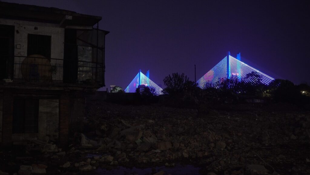Into what might seem like an “objective” mix of cityscapes untethered from the present calamity, River Runs introduces a devastating device, presenting four letters written by Zhu and based on true stories from four grieving people, addressed to a husband, a grandmother, a father, and an older brother, respectively, all of whom died from coronavirus. These letters are presented silently, placing a line of handwritten Chinese characters on screen one at a time, each detailing the often-mundane sadness with which each person is contending, one that extends into such banal moments as chopping a chicken or swimming in the river. The third letter in particular is presented in a different manner, using typed-out characters, and provides such a clear motivation for the documentary’s images — the writer was unaware of her father’s affinity for the very bridges that form such a large bulk of the construction and backdrops here — that it seems quite possible that this might be Zhu’s own story. While this is not the case, it goes some way in detailing the ache of the film, the emotion that infuses the lonely, decaying buildings and desolate shores. Though none of this footage was initially intended as a commentary on the pandemic, River Runs creates an extraordinary poignancy both within and outside of this unexpected context. Zhu understands that, traumatic as it was, coronavirus merely intensified daily struggles, the loneliness and discomfort with which the vast majority of people have been living, and that quarantine mingled with and transformed their conceptions of places and people just out of reach in both space and time. By mapping those melancholy feelings and hazy memories onto the specifics of a city ever in flux, River Runs charts the present state of existence with stunning, heartbreaking clarity.
