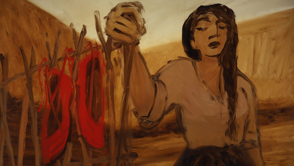 Anna Podskalská’s Red Shoes presents a popular and insidious trend within contemporary animated cinema at the moment, with its animation style aping the oil-painting-on-canvas approach taken with critical darling Loving Vincent from a few years previous. This specific style isn’t one that lacks some level of base praise, albeit more for the time that was put into the final product than what was allocated for storyboarding, but it feels entirely like a technical flex searching for a pronounced visual aesthetic. Some issues to work out upfront to help clarify this stance: The bulky and thick brush strokes that comprise each character restricts their movement into more obvious gestures, taking out most of the motion from anything that’s not a central object. So while each individual frame is being painted, only a few sections of the composition are being affected, making for some stiff gestures and lifeless backgrounds. It also never looks particularly good as a general practice, coming off as crude and unmemorable by most modern animation standards — hell, even the carbon-copy thick-line CalArts style of most running American cartoons has a little something more of a visual flair going for it than stuff of this ilk.