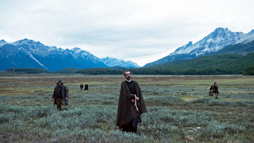 If the first chapter — in which the ill-fated love of Luciano and a shepherd’s girl, Emma (Maria Alexandra Lungu), ends tragically after his rebellious acts against the local tyrannical prince — situates Righi & Zoppis’ film within the prolific lineage of earlier Italian masters like Pier Paolo Pasolini and the Taviani brothers, and alongside contemporaries such as Pietro Marcello, Franco Maresco, and Michelangelo Frammartino, the second chapter (ominously and farcically called “The Asshole of the World”) easily evokes the profundity of Lucrecia Martel’s Zama and Lisandro Alonso’s Jauja, but in its own singular manner. It works as a logical aesthetic decision too, as from this point in the film forward the rural Italian setting of its first half morphs into the arid deserts of the Tierra del Fuego archipelago (translation: “Land of Fire”) in Argentina’s southernmost region of Patagonia — the relocation isn’t unlike a descent from some verdant paradise into the very bowels of hell. And so this is where the story continues forth from, as Luciano, now self-exiled and impersonating a missionary, finds himself among a bunch of pirates and mercenaries in search of a long-hidden royal Spanish treasure at the bottom of a faraway lagoon that only a giant crab can guide them to.
