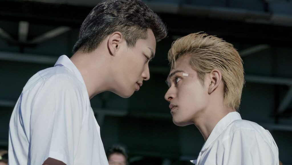 Apart from some specific action sequences (mostly gory fistfight sequences), which seem to be the Hanabusa’s primary focus — competent without ever overtly impressing; well-choreographed and effectively pacing — everything else here, including the romance between Takemichi and Hinata, never really function at the same energy level and remain underwhelming. But if there’s any redeeming factor that keeps Tokyo Revengers somewhat engaging until the end, it’s the film’s aesthetic of flamboyant, punky appearance, and the excellent performances Hanabusa coaxes out of the massive acting ensemble. This strength is especially pronounced when it comes to the two main Manji gang members, leader Mikey and right-hand man Draken, who bring a little force and hip rhythm to the proceedings thanks to Manjirō Sano and Yûki Yamada’s respective work. But despite this appealing sheeling and occasional injection of spirit, there’s just not enough to give these under-developed characters (unforgivable for the Moebius gang members) any depth or nuance, and ultimately renders everyone here mere cosplayers. Still, Tokyo Revengers has already become one of the highest-grossing box-office hits of 2021 in Japan, which means plenty are able to overlook Hanabusa’s omission of narrative color and his decision to remain pro forma with his film adaptation rather than aiming for anything more ambitious. A more cynical take, however, sees in that only proof that Tokyo Revengers can win over predisposed manga diehards by the virtue of simply transforming cartoon characters and worlds into something more “real.” For those whose praise isn’t a foregone conclusion, it will likely prove disappointing, unimaginative, and only partly-conceived affair.