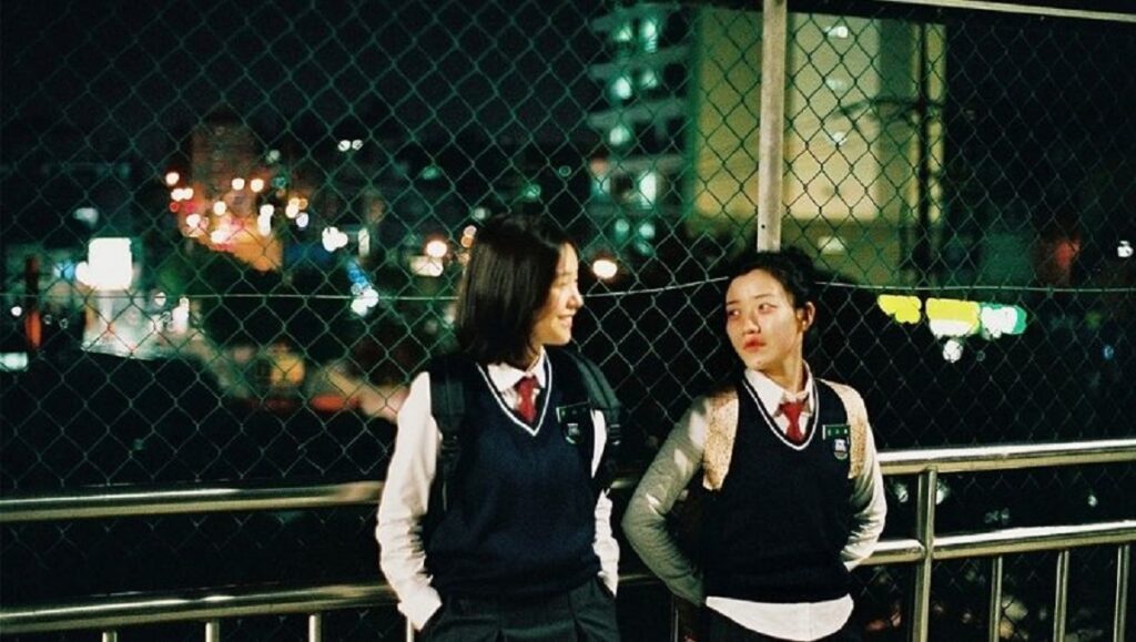 The story is told through flashback, framed by the voice-over narration of high school student Kang-yi (Bang Min-ah) on a lonely train ride, describing her two best friends Ah-ram (Shim Dal-gi) and So-young (Han Sung-min). Fragments showing the three in school give way to them escaping from its strict structures and carousing in the streets of Seoul, renting rooms for the night, or sleeping in the street instead of returning home. On one of these returns, we catch a glimpse of Kang-yi’s homelife, a comfortable middle-class existence with aloof but seemingly well-meaning parents uncertain what it takes to keep their daughter at home. While we never see the other girl’s parents, enough background is dropped for us to get a sense of the dynamics: So-young’s parents coddle her with presents on each return, while Ah-ram is physically abused for it.