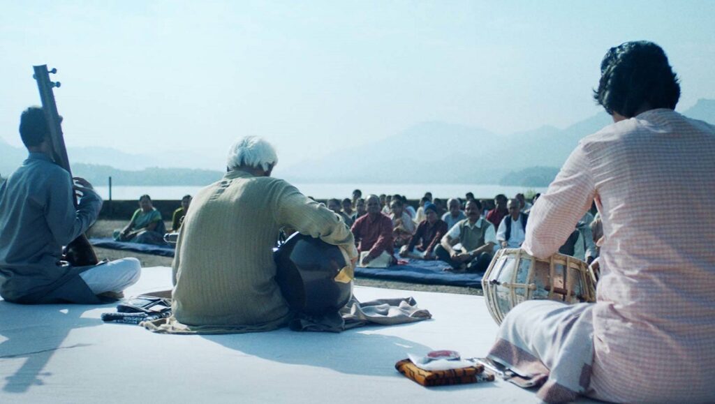 The burden of tradition makes itself felt throughout Chaitanya Tamhane’s sophomore feature, The Disciple. The story template is familiar: that of a striving artist — a young Indian classical musician, Sharad Nerulkar (Aditya Modak) — haunted by the prospect of turning into his bitter failure of a father. But Tamhane’s meticulous, measured direction keeps our sense of the character and his own self-awareness ever out of sync. The film’s visual style — extreme wide-angle long shots and slow, near-imperceptible push-ins — gives every scene a certain autonomy, while maintaining a cool distance from the characters. Likewise, Tamhane finds a number of ways to unsettle what would otherwise be a too-neat trajectory, continually preventing us from uniting our expectations for Sharad’s life with his own outlook on it. After the film’s most (deliberately) generic scene — a quasi-dream sequence in which his greatest fears are voiced aloud — these perspectives come apart altogether.