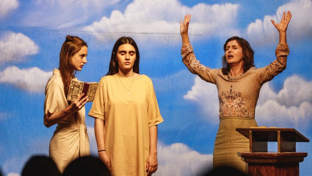 There’s a furious call to revolution at the heart of Mariana Bastos’ Raquel 1:1, a sneaky-smart exploration of institutionalized misogyny masquerading as a vaguely “elevated” horror film. Still dealing with the emotional fallout from the recent death of her mother, Vera (Valentina Herszage) and her father, Hermes (Emílio de Mello), have left the city to return to his familial home in a small Brazilian town. Hermes has lost their family bookstore, accruing massive debt in the process, and has decided to move himself and Vera into his mother’s home and try his hand at being a grocer. As they settle in, Vera walks around town and meets a group of evangelical girls involved in the town’s church, led by the pastor’s daughter Ana Helena (Priscila Bittencourt). They’re eager to welcome someone new into the flock, and for her part, Vera seems genuinely pious, excited to make friends and celebrate Christ. She attends some youth meetings, enjoys a karaoke party, and is introduced to a local spot where people gather to swim. It’s here that Vera finds herself alone one afternoon, deep in the secluded forest, when a faint voice seems to beckon her to a cave. She tentatively enters, and the film cuts to black.