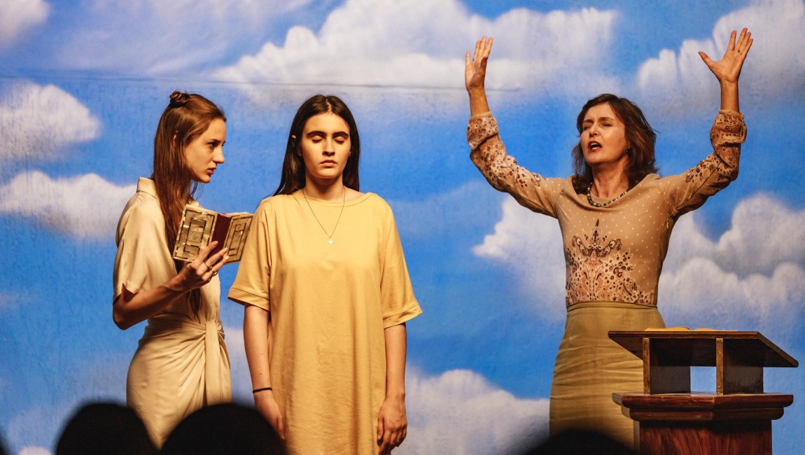 There’s a furious call to revolution at the heart of Mariana Bastos’ Raquel 1:1, a sneaky-smart exploration of institutionalized misogyny masquerading as a vaguely “elevated” horror film. Still dealing with the emotional fallout from the recent death of her mother, Vera (Valentina Herszage) and her father, Hermes (Emílio de Mello), have left the city to return to his familial home in a small Brazilian town. Hermes has lost their family bookstore, accruing massive debt in the process, and has decided to move himself and Vera into his mother’s home and try his hand at being a grocer. As they settle in, Vera walks around town and meets a group of evangelical girls involved in the town’s church, led by the pastor’s daughter Ana Helena (Priscila Bittencourt). They’re eager to welcome someone new into the flock, and for her part, Vera seems genuinely pious, excited to make friends and celebrate Christ. She attends some youth meetings, enjoys a karaoke party, and is introduced to a local spot where people gather to swim. It’s here that Vera finds herself alone one afternoon, deep in the secluded forest, when a faint voice seems to beckon her to a cave. She tentatively enters, and the film cuts to black.