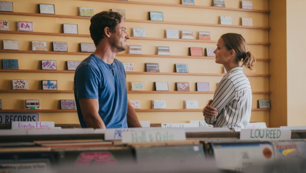 Romantic drama Press Play inadvertently stumbled into a bit of good luck thanks to the two-year delay of monster blockbuster Top Gun: Maverick, which features leading man Lewis Pullman in the role of the dorky-but-loveable Lt. Robert Floyd, AKA Bob. Without his presence, it’s safe to assume that not a single person over the age of 12 would even give Press Play a passing glance, its story of eternal love through the lens of time travel so trite and banal that it could almost play as satire. Clara Rugaard stars as Laura, a twenty-something artist spending the summer in Hawaii with best friend Chloe (Lyrica Okano). At Chloe’s urging, Laura agrees to meet her friend’s stepbrother, the dorky-but-loveable Harrison (Pullman), who works at a local record store. Sparks instantly ignite, and it isn’t long before the two are inseparable, she showing off her paintings that register roughly at the level of airport terminal art, he explaining his love of vinyl and cassette tapes over digital streaming (“You have to flip it over. It’s interactive.” That no mention is even made of sound quality only proves the stupidity of Harrison’s hipster line of reasoning.)