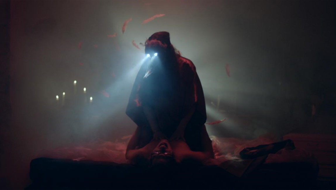 Kevin Kopacka’s Dawn Breaks Behind the Eyes is a curious beast, a Peter Strickland-esque pastiche of low-budget ‘70s European horror movies — think Amicus more than Hammer — that switches gears so many times that it’s almost impossible to describe the plot without giving the whole thing away. Having said that, the movie ultimately fractures its own reality to such a degree that there’s less and less plot to synopsize, only psychedelic visuals and strange, ominous vibes. It begins simply enough; unhappily married Margot (Luisa Taraz) and her aggressively disagreeable husband Dieter (Frederik von Lüttichau) are traveling to a remote mansion in the dead of night. They’ve recently inherited it from a wealthy member of Margot’s extended family. Dieter is an emasculated prig, a leech with no money of his own who can’t wait to fix up and sell the place. But Margot feels drawn to it, as if it somehow has a power over her. As the pair investigate the property, Dieter comes across something terrifying in the basement (although the audience doesn’t see whatever it is) while Margot begins seeing spirits, ghostly specters that stir something within her. The mansion is a marvel of set design, an immaculate recreation of an old haunted house complete with cobwebs, ancient-looking fixtures, and willowy wisps of fog that creep about through windows and ominous doorways. The duo is forced to spend the night in the haunted abode, and an unsuccessful attempt at sex leads to a fight between the increasingly harried couple.