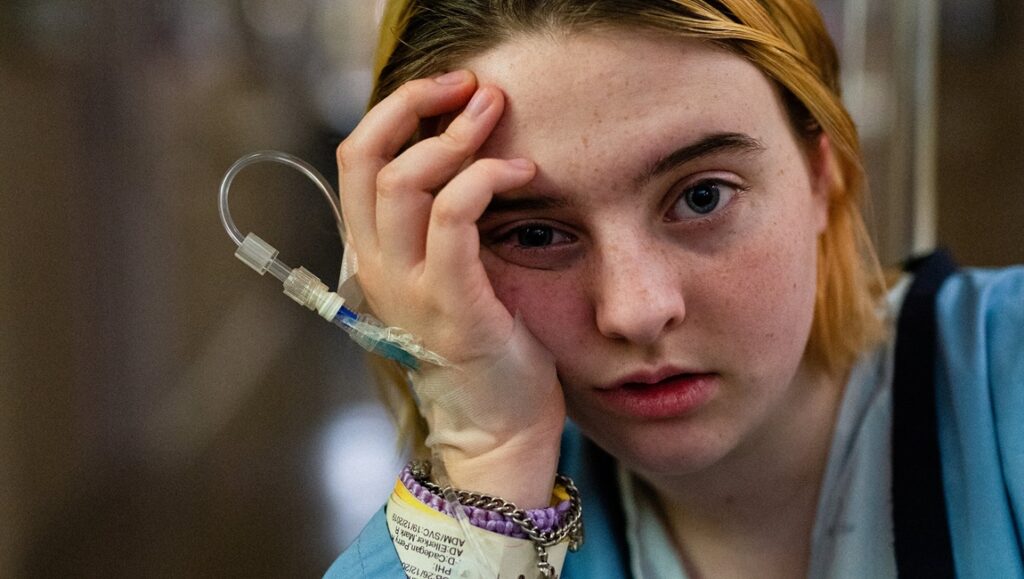 The post-intake opening of Queens of the Qing Dynasty, set deep inside a Cape Breton hospital, could connect lead actor Sarah Walker with other high-voltage performances of institutionalized life, whether it be the gliding POV of Joan Crawford in Possessed or the improvised creative distance of Gena Rowlands in A Woman Under the Influence. Indeed, the case could be made that Ashley McKenzie’s second feature is a rival for the heights of those films’ intensities, but the manner of how it arrives at psychological explanations and dramatic catharses for its characters is altogether something else. Star (Walker), a patient, and An (Zheng Ziyin), a volunteer caretaker, each experience the constraints of normative behaviour models applied respectively by the healthcare and immigration systems of the Canadian state. McKenzie’s film understands that to merely prove the existence of their pain or intelligence would be beside the point; rather, in its jarring sense of montage, each shot and sound jolting the next, Queens of the Qing Dynasty creates the effect of reality breaking apart, in such a way that coded banter, virtual reality, and electronic feeds — texts, animations, and blasts of music — are formed by and respond to the film’s duo in a varyingly plastic manner. (In this way, McKenzie’s film is consciously influenced by the ideas of the musician SOPHIE, whose collaborator Cecile Believe features on the soundtrack.) Rather than a psychodrama, perhaps the only other film that readily comes to mind for comparison is Jia Zhangke’s The World — specifically, in the way it utilizes animation. McKenzie’s characters take flight too, yet this sensation carries over even to their super closeup-framed dialogues in the isolated world of Cape Breton Island. They acquire each other’s wavelengths — inexactly, and at times distressingly — but their visions combine in such a concentrated way that it’s as if they are reversing the polarity of modern psychoanalysis, rendering professionalism null and instead respecting the unknown capacities of both psychical and physical reality. — MICHAEL SCOULAR