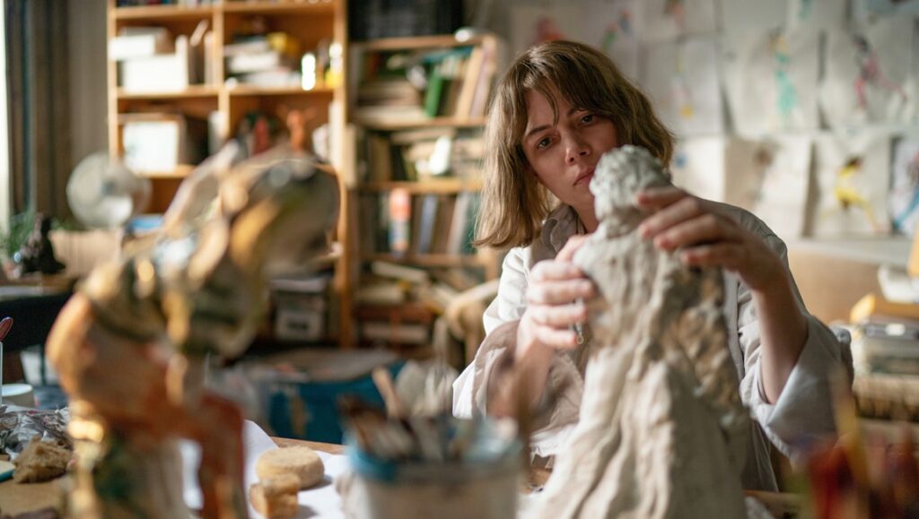 Kelly Reichardt’s movies have always been concerned with the little moments that most of our lives are made up of — understanding the everyday dramas as more consequential than the cataclysmic and supposedly defining events — and seldom have those moments been smaller than in Showing Up. Michelle Williams, in her fourth collaboration with Reichardt, plays Lizzy, a stiff-shouldered and poorly dressed artist trying to complete her small exhibition of sculptures while constantly being interrupted by a quiet farce of annoyances and distractions. Some are bigger than others, from her landlord and fellow artist jovially procrastinating on fixing her hot water supply to the burden of making small talk with colleagues at her teaching job, but she refuses to endure any of these indignities with grace.