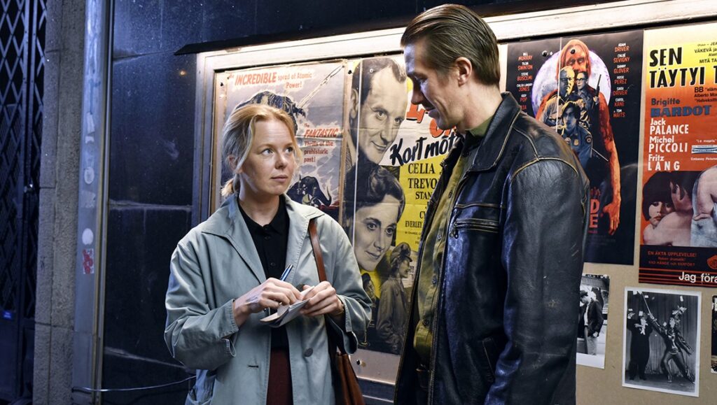 Kaurismäki’s masterful timings — of the performers’ actions or inactions, sudden or prolonged pauses, and dialogues — are crucial both in the development of his modest, sympathetic story and in order to extract a kind of Kafkaesque or Beckettian absurdism. They also prove instrumental in motivating vitality from beneath the dead façade of this somewhat purgatorial world, where its inhabitants mostly find themselves idle in dive bars, drinking, smoking, listening to music, or indulging a little karaoke — in other words, they don’t really spend time as much as they try to kill it. Whether via an old radio (broadcasting the news of war), an antique jukebox, or a local arthouse movie theater — where Kaurismäki pays tribute to Jim Jarmusch’s The Dead Don’t Die and also draws similarities between his characters and their zombie-esque existential conditions — the closed-off, isolated spaces of Fallen Leaves connect themselves to the larger outside world, with even the names of the bars (California or Buenos Aires) intentionally evoking the recurring motif in his other off-kilter and subversive romantic dramedies, where their characters dream of farflung, romanticized destinations.