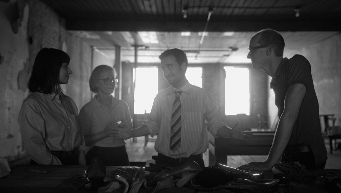 Pete Ohs’ amiably idiosyncratic new feature Love and Work is set in a future where jobs are illegal. It begins with Diane (Stephanie Hunt, also credited as a producer and screenwriter on the film, having filled all three roles on Ohs’ earlier film Youngstown as well) seeking a new job. She enters a large warehouse, in which the framing only further isolates the few people present, and announces herself. Her interview with Hank, the boss, comes across not as a formality, but a ritual. He introduces her to her two co-workers, Fox (co-writer Will Madden, who also previously collaborated with Ohs on Jethica) and Evelyn, and she gets to work. Clearly the outlawing of work has simplified it, as the three stand around a large table of old shoes, combining parts into what look more like art objects than functional products. Only after two safety-vested officers shut the operation down, giving Hank his “third strike” and the rest warnings, does a Sam Elliott-esque narrator begin to explain what’s going on.