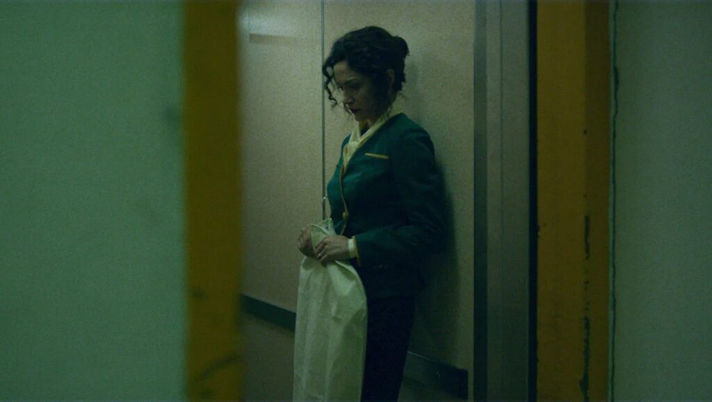 The Postcard Killings, led by Jeffrey Dean Morgan, also applies a different set of formal poetics, operating in a much darker and more genre-inflected style. In one scene, Morgan’s Jacob Kanon peers in on the police investigation of a young married couple who are suspects in a series of serial murders that include Jacob’s daughter. (One of the film’s major twists is the couple are siblings, bringing back the somewhat puzzling incest-adjacent subject matter that remains difficult to intelligibly parse.) The investigation, at least for this viewer, works as something of a turning point from understanding the couple as potential victims to potential killers. Nothing in their story is terribly damning, allowing the cops to justify their release of the couple and to maintain a degree of mystery that the crime genre would be boring without. But the scene leaves an uneasy pit in the viewer’s stomach, largely because of its visual presentation rather than any expository breadcrumbs or information revealed in the questioning. The “husband,” Mac Randolph (Ruairi O’Connor), sits on the right of a table with a cop, a tripod camera to the left. A maze of mirrors above the table creates a black void at their vanishing point. After the cop leaves, cinematographer Salvatore Totino (Spider-Man: Homecoming, The Da Vinci Code) keeps the camera on Mac and the now empty other half of the table without reframing or pushing in. In a parallel setup with “wife” Sylvia Randolph (Naomi Battrick) on the other side of the table, in a different empty room, editor Sean Barton (Return of the Jedi, The Fly II) creates the illusion that they are on the other side of the mirror from each other rather than the room of cops. The score, an ambient drone, cuts to silence. We get no true closeup of either after the cops leave, although the camera does move a bit closer to Sylvia. But Totino’s camera takes care to keep its distance, denying the exact sort of profound humanization that is expressed in the closeups of Martin and Azra’s copulation in Cirkus Columbia. As the scene ends, there is no doubt that something is not quite right with Mac and Sylvia — an unsettling truth entirely communicated through formal technique.