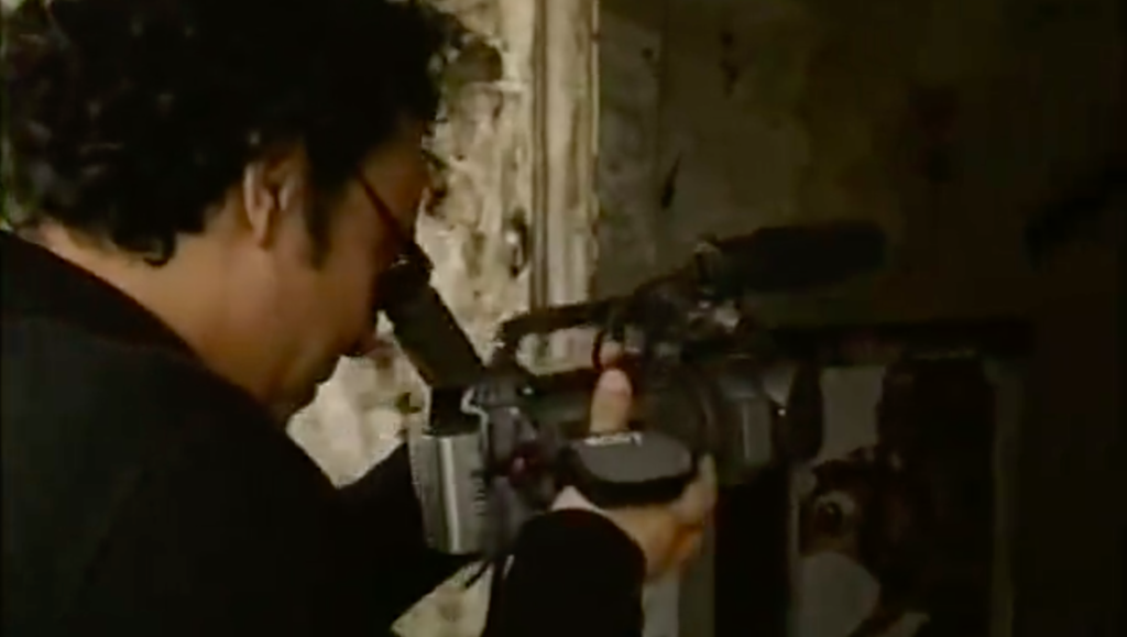 Perhaps in response to the documentary notions that trailed his work, Al-Zobaidi increasingly carried the ambitions to stage fictional scenarios within his work. If the thesis in Crossing Kalandia is that the absence of a meaningful Israeli Left is an extreme outcome of the same symptoms that can be felt anywhere, perhaps even in the fragile solidarity — the isolation and fear — of Palestinians, then Looking Awry (2001-05), in its ironic quest narrative, suggests a way this can be viewed from a more distant vantage point, this being the remote editing room of a higher-budget video commission. The film “Sobhi” has been commissioned to make — a trite panacea about religion — doesn’t need to necessarily correspond to the type of films that festivals or audiences would expect to be made in Palestine. By wrapping the moment when Ariel Sharon entered Haram al-Sharif in a broad and easily-punctured satire, Al-Zobaidi wants to make it comprehensible as an action, rather than a vague bit of politics or the inciting incident for a movie. This isn’t the first time this kind of approach shows up in his work — the shadowing of Haaretz reporter Amira Hass in Crossing Kalandia, not to mention the handheld tracking of Al-Zobaidi at work with his own camera, function as the intentional foregrounding of artifice, not to make their subjects stand out in relief as “more real,” but to drill down through different modes of image-creation.