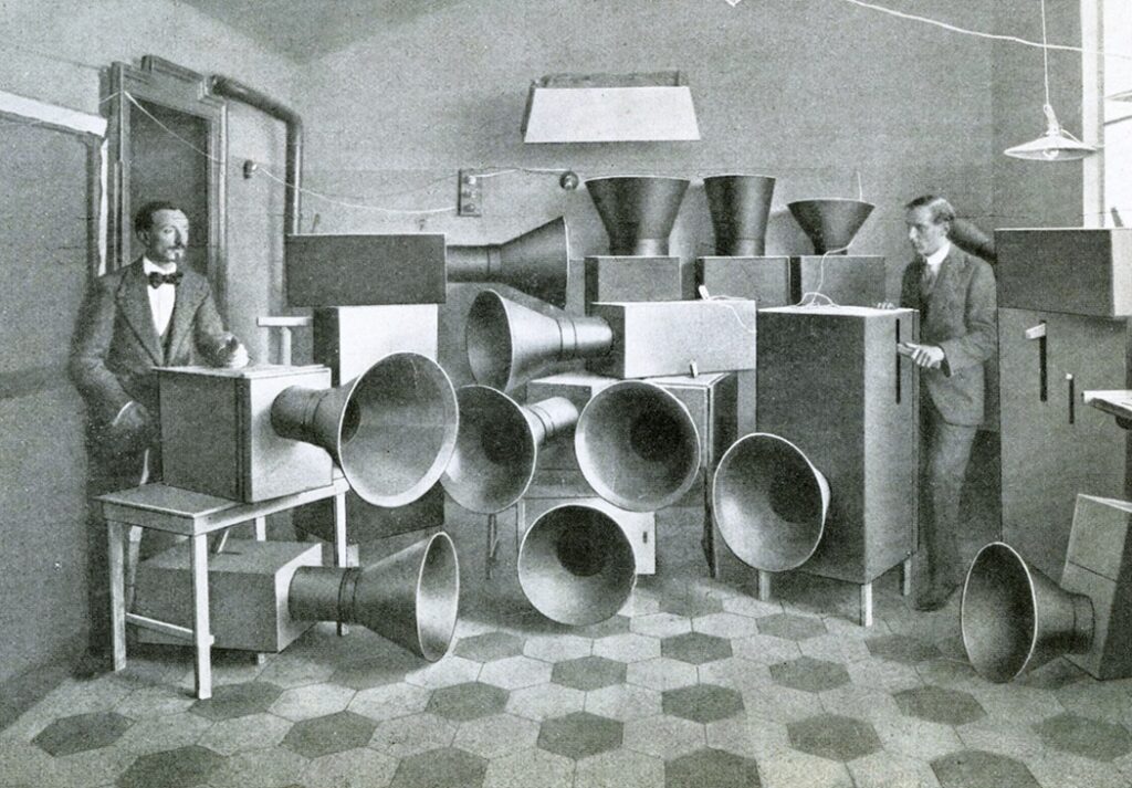 The city Milan in the year 1913. An intrepid wanderer might stumble into a workshop, and find there a multitude of unusual boxes, kitted out with large horns. It’s not clear what purpose these boxes serve, until a bow-tied Italian enters, with spontaneous vigor, and instructs this intrepid wanderer on their use. These contraptions emit a strange, growling noise. The Italian — Luigi Russolo — tells the intrepid wanderer that this is the New Music; that these devices go far beyond the familiar sounds of the woodwinds, the strings, the old percussive instruments. In these boxes is the sound of machines. The New Music, he goes on to say, will not be focused on tonality, nor on rhythm, but it will be the particular quality of sound. The ears of an urbanite have become so accustomed to the industry of noise that the old tones grow tiresome; we are a people in need of new, different sounds. Sound that better encompasses the great spectrum of hearing. Sounds that better reflect the new world. Russolo gestures to the assortment of boxes — the Intonarumori he calls them — and says that people of the future will see these contraptions as the beginning of a new era of sound-production. Russolo tells the intrepid wanderer that he is a lucky man, to be here at the beginning. But then the snag: the intrepid wanderer has come from the future. And he had never heard of Luigi Russolo, nor his squeaking boxes.