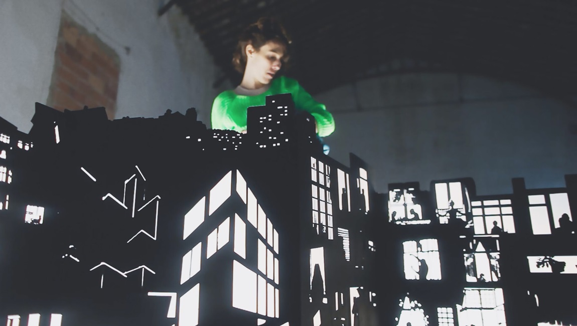 Chilean filmmaker Antonia Rossi’s The Spirit of the Spider is a busy, at times cluttered, film that largely focuses on solitary creation. Most of the film consists of a sculptor (Maria Garcia) producing a large installation work in an otherwise empty warehouse space. Rossi begins by showing us the artist digitally cropping images on a computer, eliminating margins and altering color and texture. We soon get a look at her larger project: she is building a miniature city made of metal silhouettes, black buildings with white light shining through their negative space. We see figures in the windows, and assorted figurines and other objects, as Garcia arranges and rearranges them in the studio.