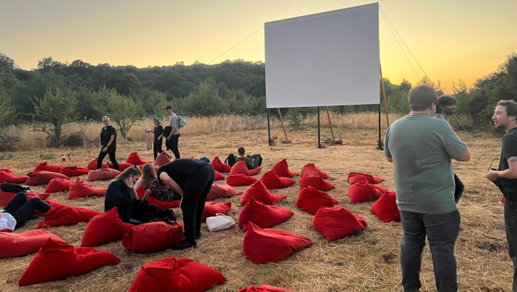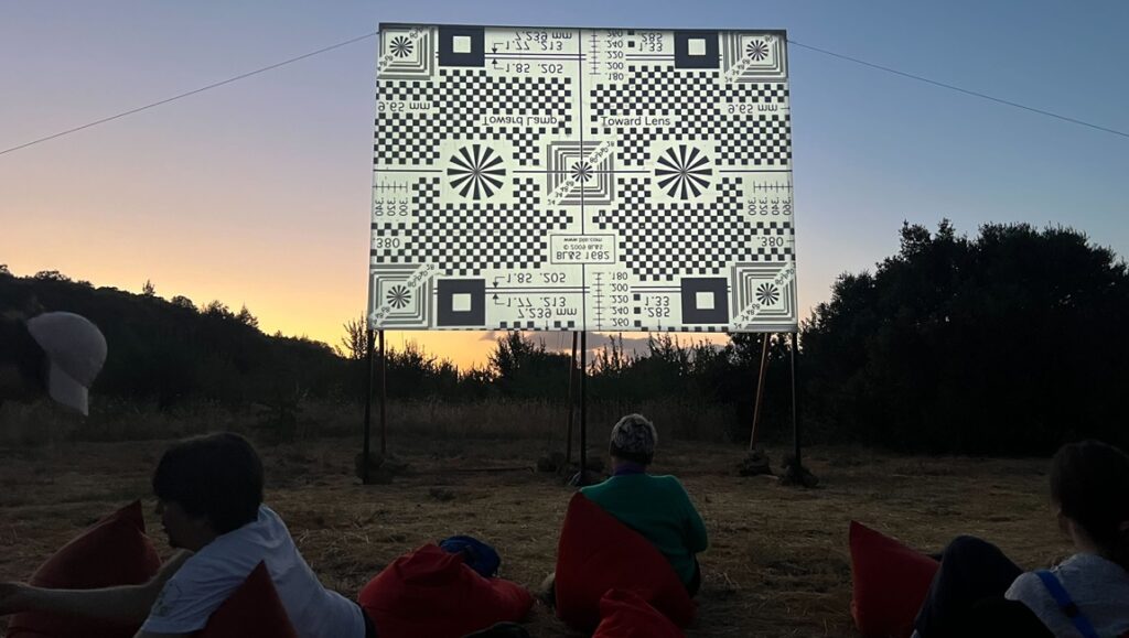 The site for the Temenos is outdoors and generally requires a half-hour walk, ending in a field featuring a white screen held up by wires and beanbag chairs making up most of the seats. The screening begins when the sun begins to set, and certain sights and sounds are just as common as the portions of black and white leader: the insects, the stars (shooting stars were sighted repeatedly on the first night), the occasional airplane in flight or a satellite quietly orbiting, village dogs barking. The sections of white leader are maybe the best visual demonstration of light pollution that I’ve ever seen: when the screen turns white, the stars seem to disappear. Falling asleep is common, but the bright light of the film and a general inability to fall asleep in the cold open air meant that I cannot testify to what falling asleep to Eniaios is like.