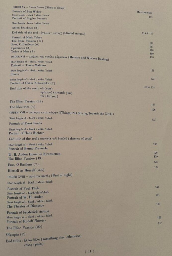 All of the titles listed in Greek never actually appear in the films, and the titles for individual cycles are not particularly illuminating. The end titles for the reels allow for a certain amount of poetic interpretation: the “blissful statues” of Sleep of Sleep are possibly in reference to a repeated flash of what appear to be legs arranged as precisely as carousel poles, while Memory and Wisdom Healing’s “you / towards you / for you” strikes me as a dedication to Beavers and/or the viewer. All the Orders seem to begin with portrait films and location footage, then generally conclude with deconstructions of the iconic images of Markopoulos’ most famous titles: from his academic passions to his carnal ones, all rendered fleetingly but in a sense of total enrapturement.