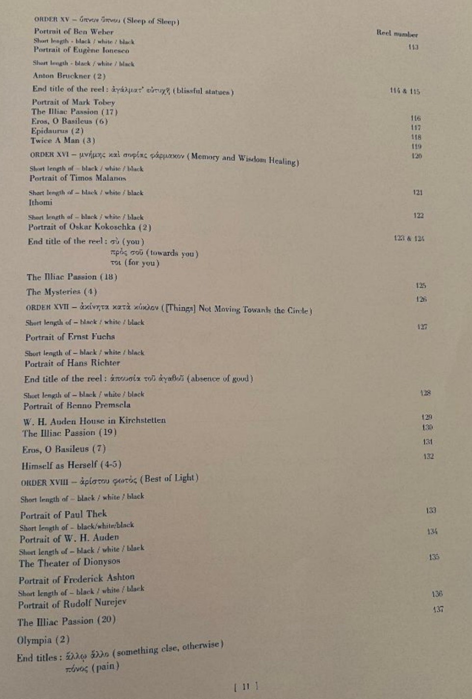 Let us begin as I started: in media res. Two moths, born far too late to appear in the flurry of wings that made up Stan Brakhage’s classic Mothlight, decided to make their own contributions to the history of experimental film by flying into the projector on the nights that Orders XVI and XVII of Eniaios were projected. The first moth resembled an enormous hair in the gate, and even after they stopped the projector to clean its remains, one stubborn portion marred the top of the frame during the moments featuring a white screen until the reel was over and they could properly remove the rest. The second was not as prominent, resembling something like a scratch or a burn mark and being fairly easy to remove. It was hard to feel unsympathetic to the poor creatures: they were, like us, drawn to the allure of the light itself, before it faded away.