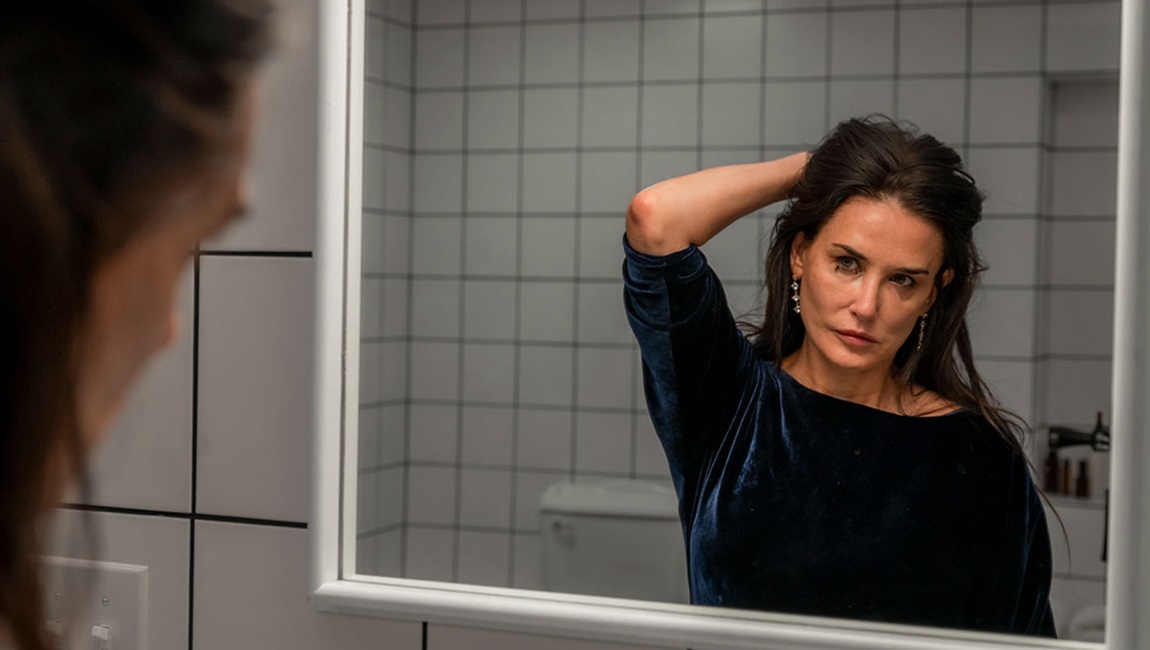The film’s setup is itself a bevy of references — All About Eve, Sunset Boulevard, Dr. Jekyll & Mr. Hyde — but none are touched upon as much as The Picture of Dorian Gray. Just as Dorian’s portrait becomes more sinister in relation to the young man’s nasty sins, Elisabeth’s body suffers from stealing time for Sue. A mild necrosis becomes severe necrosis, half of her face withers into old age, and, with enough time stolen, all of her features become comically monstrous, like the ass-creature from Society (1989) complete with the gross-out humor of a Garbage Pail Kid. And in case the Wilde reference isn’t literal enough, an actual gigantic portrait of Elisabeth that is visible in nearly every shot of her gaudy LA apartment is replaced with a portrait of Sue during the Sue weeks. And, by God, if that portrait isn’t in frame, a gigantic billboard that changes with Sue’s rise will hover outside her window. Given the over-the-top line readings from every ancillary character, this reference is knowingly, cheekily obvious, which has about as much charm as the purposeful camp, which this movie also is.
