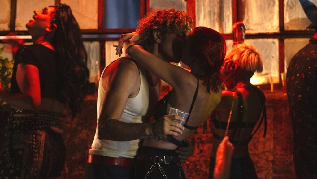 Simons points to Jacques Rivette as a reference point for Jackson’s film — and indeed there are some parallels to be drawn in how Rivette and Jackson use theater as a method both in the diegesis of a film and as a way of transforming the artifice of cinematic performance into a world of spontaneity. However — and this is perhaps a result of this writer’s Baltimore bias — a more apt comparison to make might be toward John Waters. Not in the sense of Waters’ inclinations toward direct taboo-bending or wondrous vulgarity; instead, Underground Orange feels at home with the radical communal aspects of Waters’ work, something that was usually obfuscated during Waters’ most successful times as a filmmaker. It became clearer and clearer as time went on that Waters’ films always were about his violently queer and beautifully anarchic friends at a very specific place in time, and it took until Waters’ nearly sentimental Baltimore return with Pecker (1998) for those sticking around and still watching his movies to realize that that was essentially what he been doing the whole time. The closest film to Underground Orange, though, is Waters’ maligned Cecil B. Demented (2000), wherein a diverse group of young people (diverse in every way — in race, in gender, in sexuality, in movie taste) go to war with bad movies, combining the act of terrorism with making art. It’s also a tribute to Waters’ friends from his younger Dreamlander days, where the ensemble is made up of thinly-veiled reflections of his old regulars. The ensemble is equally important to Jackson: the dynamic between his romance with Paty (Sofía Gala Castiglione), Goya’s (Bel Gatti) distrust of it, his more easy-going relationship with Dante (Gianluca Zonzini), and the stewardship of the group by Frida (Vera Spinetta) serves as the main dramatic tension of the film while the group is readying their play and more direct, confrontational politics.