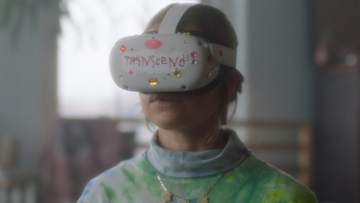 But within the game, there’s a sense of calm — at least, at first. Clips of paths in the forest or crashing waves feature an ambiguous voiceover: “The ocean. It arrives. Be the ocean. Breathing.” Jodiiie progresses through the game’s 12 levels, the latter of which are more anxiety-inducing than distracting: a video game character with only 12 minutes to live, a plane without a pilot. After completing the twelfth level, Jodiiie has seemingly reached her goal; we see her attending the party she invited all her friends to, but still wearing the VR headset that puts her within the game. It’s in this blend of the real and real-adjacent realities that Jodiiie seems to finally “transcend” her mental health struggles.