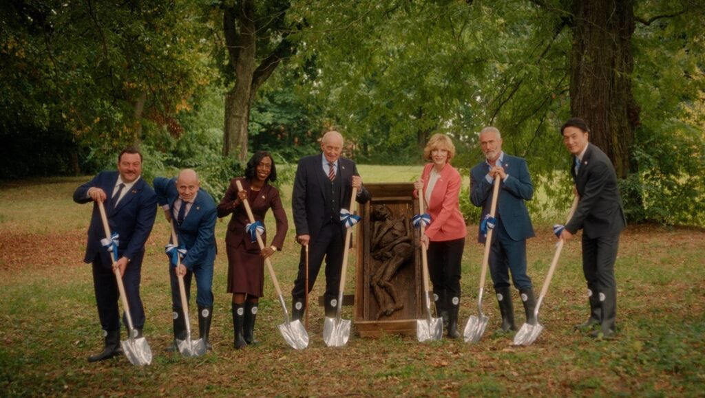 CT: It’s certainly a film that has a lot of surprises, and it’s hard to categorize them or define them. Was there a particular reason you were interested in the G7 summit? And Evan, were you channeling any influences with the diplomatic-speak throughout the script?