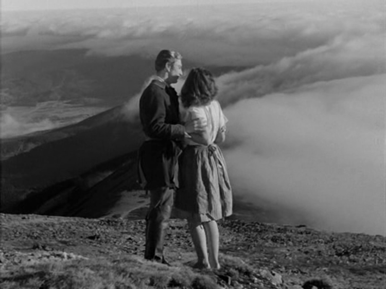 After the increase of these slights, Bára jokes with her more respectable friend, Eliska, about witchcraft. As they discuss their personal lives, Eliska wishes Bára did have magical powers that could help break Eliska free of the strict family that is pushing her to accept a marriage proposal she doesn’t want. Bára jokingly tries to summon the devil, then gasps at the sudden appearance of the man who danced with her. Placing the romantic lead in the shoes of the devil is another instance of the film playfully undermining the warped logic of the villagers’ conflations of Bára with dark magic and its dangers, since this man is one of the only stable sources of help she’s had. Bára joins him, and a succession of romantic images follow: as they playfully chase each other through the forest, they reach for each other’s hands through the trees and follow each other up to the mountaintop, where the camera pans from their kiss to the peak’s envelope of clouds and fog.