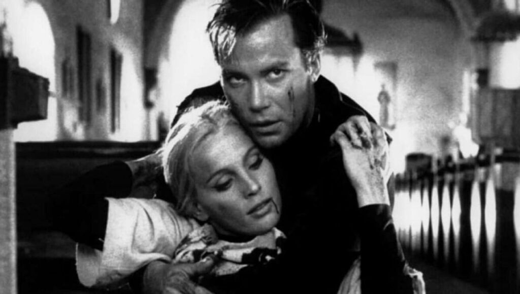 Set in the fictional village of Nomen Tuum, the story stages a spiritual confrontation between Marc (William Shatner), a wounded soldier returning home, and Kia (Allyson Ames), an ambitious succubus who wishes to corrupt only the purest of souls. To arrange their impending psychomachia, the film plunges itself in Bergmanian pathos. Look, for instance, to the moment when the two succubi, Kia and her sister Amael (Eloise Hardt), confront each other by the shoreline. These pale creatures, standing face to face in black-and-white, are realized with a claustrophobic intensity that recalls Persona’s (1966) Alma and Elisabet. Subjects to a chiaroscuro confrontation, they too turn their heads to the side, sluicing each other in darkness and light, until both faces merge into the mouthless mask of death. And because we see Bergman in Incubus’ monochrome frames, in time, we also start reading him in its themes. As God’s silence rustles in the black tree tops of Bergman’s Fårö, so does it here. Whipped up by the wind, like his counterpart in The Seventh Seal (1957), Death arrives in Nomen Tuum from deep within the impenetrable forest, in the danse macabre heading to the sea.