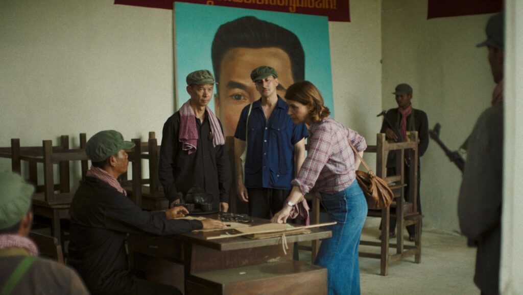 Irène Jacob plays Lise Delbo, the Becker stand-in. She’s joined by Grégoire Colin as Alain Cariou (Scottish academic Malcolm Caldwell), a Marxist activist who knew many of the Khmer Rouge leadership, including Pol Pot, in Paris before the war, and Cyril Gueï as Paul Thomas (journalist Richard Dudman), a photographer. Here, the three leads are escorted around various Potemkin villages (art studios, workshops, farms) and given standard answers about the greatness of Democratic Kampuchea, while growing ever more uneasy at the things they aren’t being told and the apparent cult of personality being built around Pol Pot (“Brother #1,” he’s oxymoronically called). Delbo hopes to find her old translator, who, as an intellectual from Phnom Penh, has either been relocated to a collective in the country or (more likely, we know and she suspects) been murdered. Cariou longs to see the success of his friends putting their idealistic theories into action, but becomes increasingly disillusioned by the obvious fraud and lurking violence surrounding them more or less explicitly. Thomas boldly escapes from their watchers and travels into the countryside, where he’s horrified by what he finds.