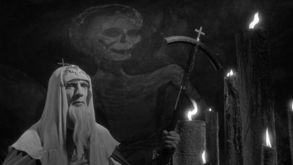 The question inherent to these Ivan films, then, is the scope of possibility: in such conditions as prevailed, is there an alternative? To relent the crown to Kurbsky, a stooge to foreign interests; to permit the boyar-tsar Vladimir, under whom the independent polities would reassert their ancient rights; or instead to endure Ivan, in whom lies a singular Russia, and a Russia independent of the lurking West, but a Russia broken under a tyrannical cosh. Therein lies a somewhat temporizing, questioning approach to the terrors of Stalin, who had led the Soviet Union through the Second World War into a stirring, destructive victory. Eisenstein intended Part III to end with Ivan, stood on the Baltic shore, staring out to sea. He has conquered all — he has secured the Russian destiny. A song is heard, sung to him by a nurse in his childhood. He is there, at the foot of infinity, a pillar of solitude. Everything — nothing — the beating waves. Perhaps this would have been Eisenstein’s most sensitive statement: a final, ahistorical image composed entirely of psychological significance, a stark and matching contrast to Ivan’s crowning in the opening of Part I. But even forgoing the unmade final act, there is a unique sensitivity in Ivan the Terrible. Eisenstein’s final, thwarted work is an indictment and a lament. A career defined by leaping optimism must finally encounter an impassable obstacle, and in discovering it swirl into gloomy style, into long shadows. The beaming clarity of his early work is vanquished, as is the romance of ¡Que viva México!, and the heroic vacancy of Nevsky. Perhaps it is appropriate that his final film should be an incomplete history: its conclusion had yet to be written.