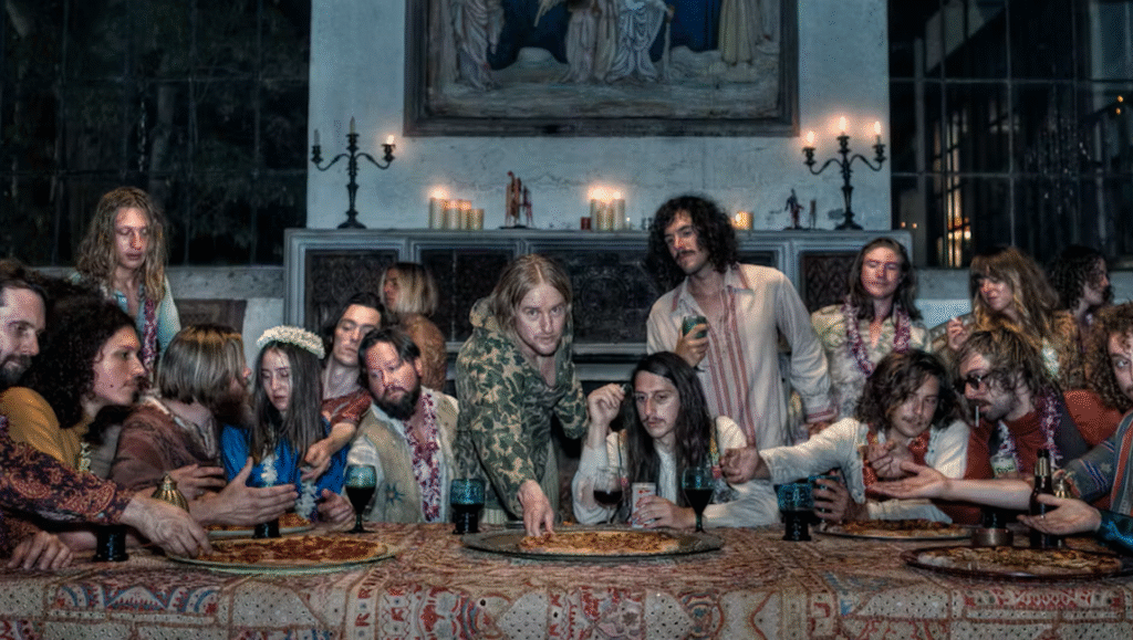 Anderson peppers wry digs at American institutions throughout the film. Members of the LAPD yuk it up at a pool party, the camera panning across the goofy tableau from behind window blinds. Doc makes a clandestine tradeoff with an antagonistic mother-and-daughter duo, Sam Cooke’s “(What a) Wonderful World” sarcastically lilting from the radio as two cars sit in an empty parking lot, probably for a mall — a brutalist building of the banal sort we saw proliferate in the ’70s and ’80s, which reached their apex in the ’90s and now sit dead across the nation. Doc also finds his way to Chryskylodon, a private mental institution run by rabid anti-communists. One of the film’s funniest cutaways features a certain Dr. Threeply (Jefferson Mays) — eyes wide, face ruddy with jingoistic enthusiasm — mouthing along to the old American propaganda picture playing for his patients.